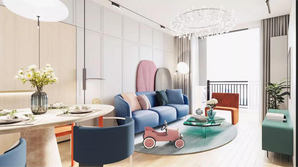 兩臥與客廳均朝南,滿足全家人的采光需要;客廳連接觀景陽臺,視野開闊,全明敞亮;同時專門設置了兒童娛樂烹飪照看區,人性化設計盡顯生活美好。