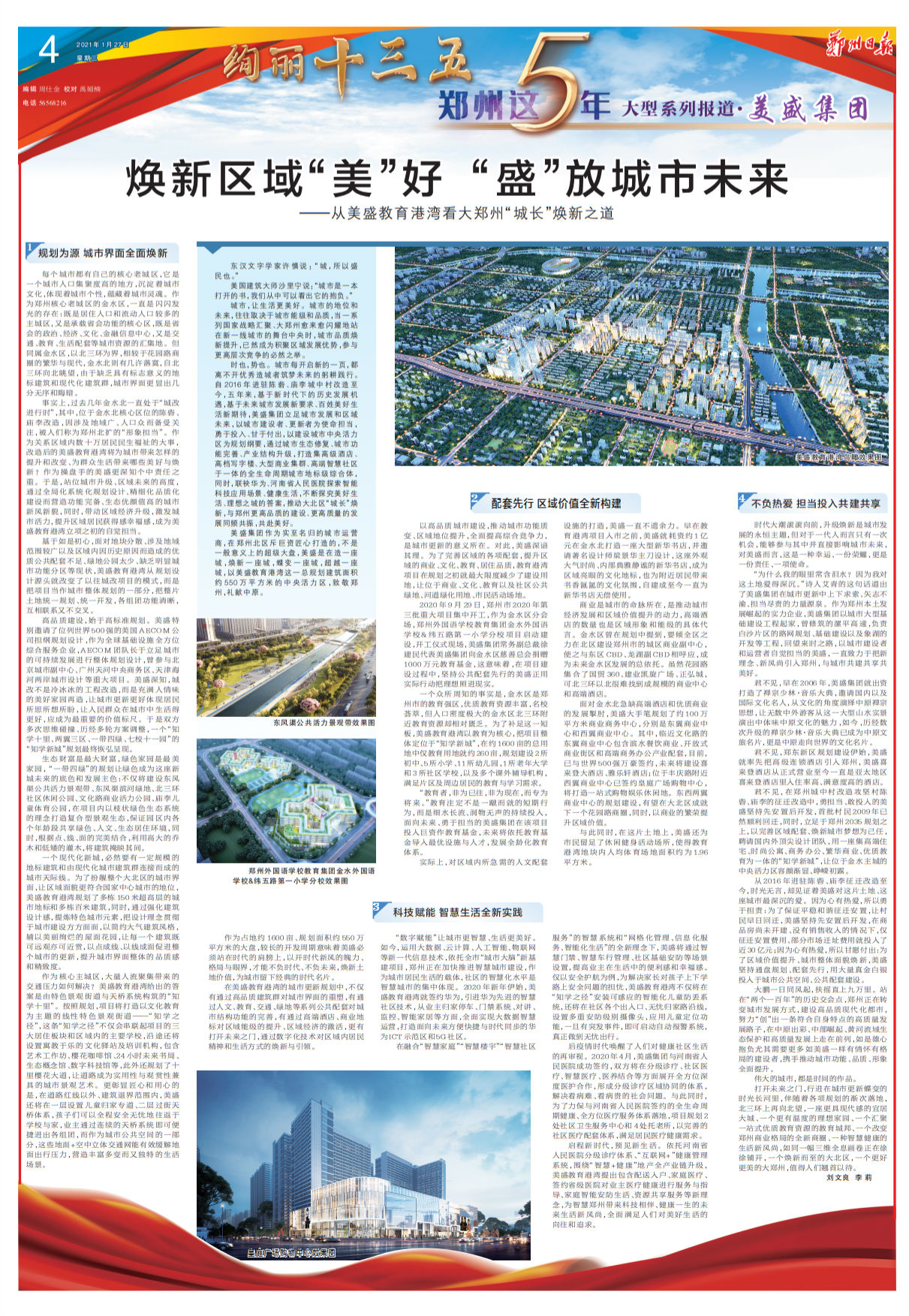 時也,勢也。城市每開啟新的一頁,都離不開優秀造城者筑夢未來的躬耕踐行。自2016年進駐陳砦、廟李城中村改造至今,五年來,基于新時代下的歷史發展機遇,基于未來城市發展新要求、百姓美好生活新期待,美盛集團立足城市發展和區域未來,以城市建設者、更新者為使命擔當,勇于投入、甘于付出,以建設城市中央活力區為規劃綱要,通過城市生態修復、城市功能完善、產業結構升級,打造集高級酒店、高檔寫字樓、大型商業集群、高端智慧社區于一體的全生命周期城市地標級綜合體,同時,聯袂華為、河南省人民醫院探索智能科技應用場景、健康生活,不斷探究美好生活、理想之城的答案,推動大北區“城長”煥新,與鄭州更高品質的建設、更高質量的發展同頻共振,共赴美好。