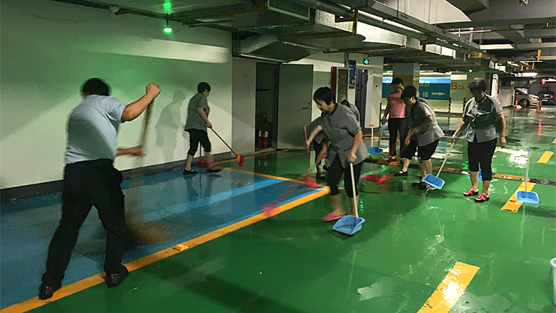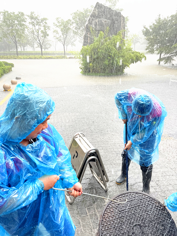 在雨水絲毫不減,越下越急的危機時刻,工程部師傅們毅然踏入水中,一點一點清理被堵的排水口,盡全力保障業主家園安全。平均年齡比其他各部門都高的環境部工作人員,絲毫沒拖任何后腿,全力向前,爭分奪秒地不間斷補位吸水排污,順利完成美盛中心地下三層車庫無積水出現任務。