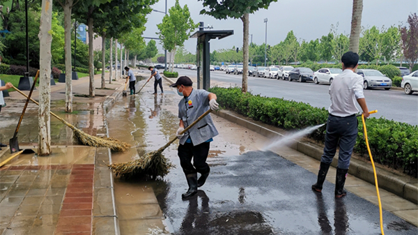 ▲工作人員及時疏通地面、屋面排水溝